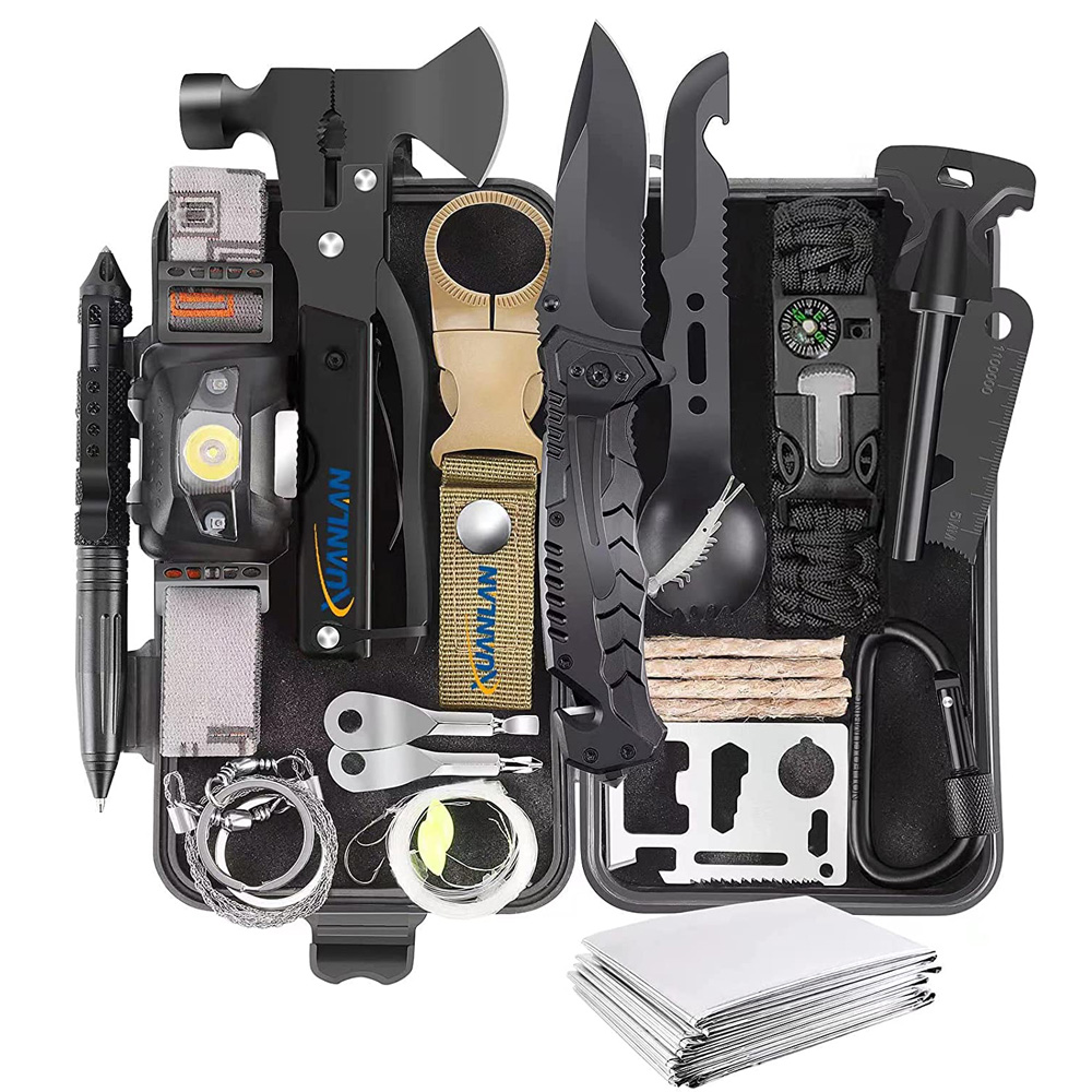 • 【Must Have Survival Gear and Equipment】29 in 1 XUANLAN survival kit contains everything you need when there is any emergency situation occurs. 29 popular camping accessories and survival gear in the kit: 15 in1 Hatchet, LED Headlamp, Tactical Pen, Bottle Hanging Buckle, 8 in1 Multi-use Spork, Survival Bracelet, Fire Starter, Fire Starting Stick, Climbing Hooks, Multifunctional Card, Wire Saw, Emergency Blanket, Fishing gear, Keychain Screwdrivers.
