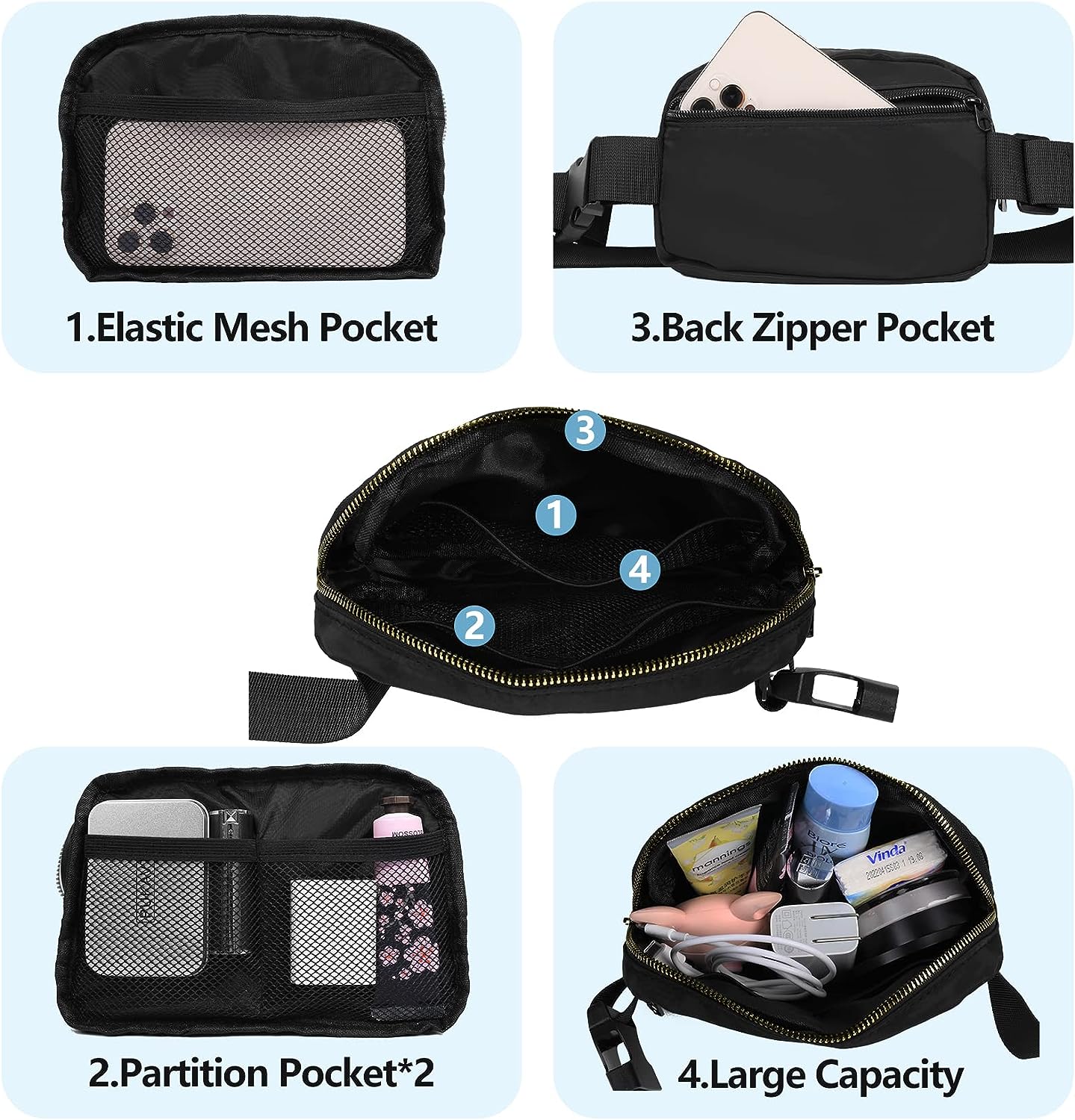 • Large Capacity: The Belt packs have one main pocket + back pocket + big insert bag +insert card pocket*2. You can put your mobile phone, key, headset, headset, sunglasses, cosmetics, wallets, passports, etc.